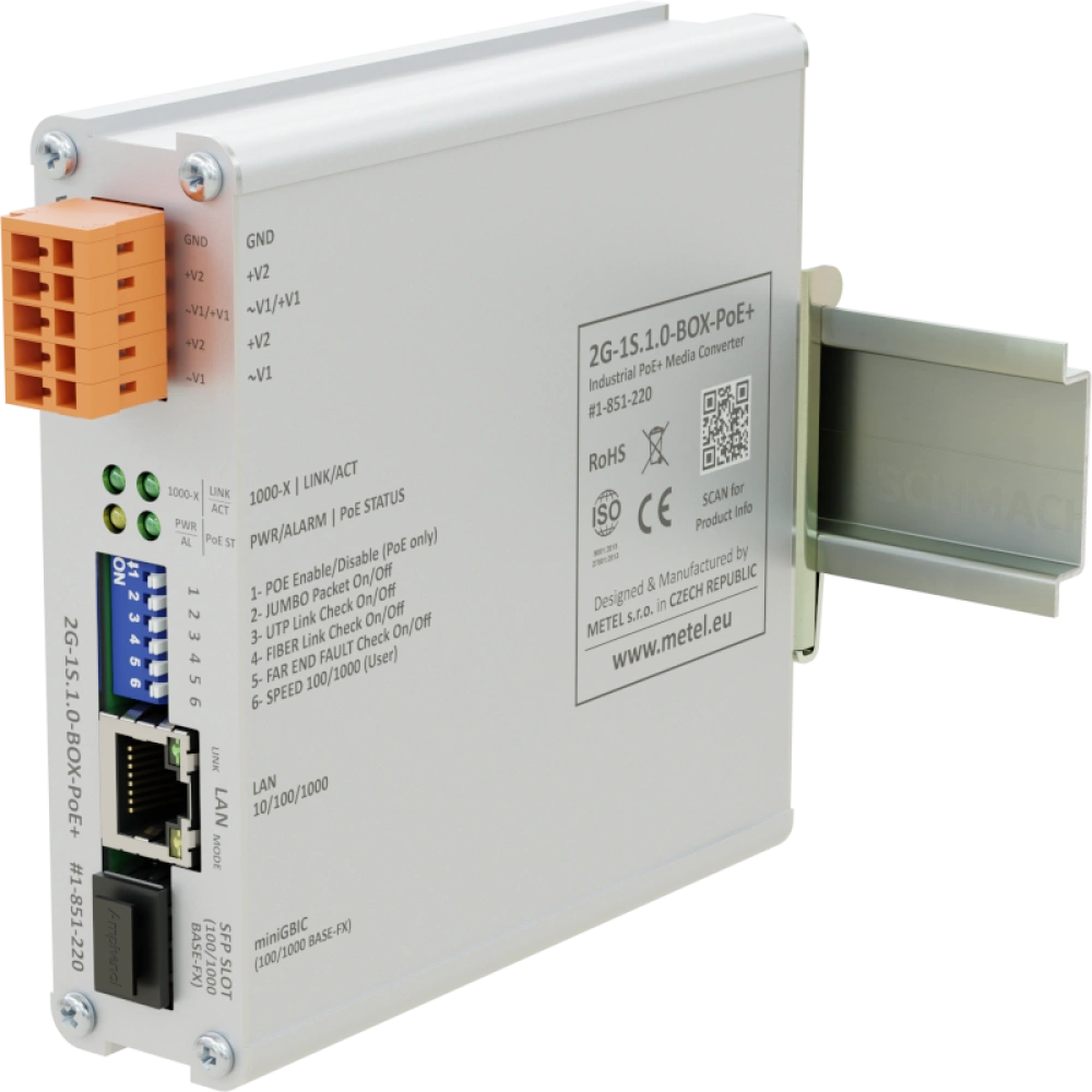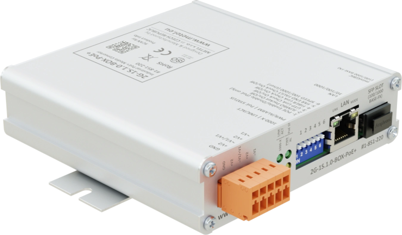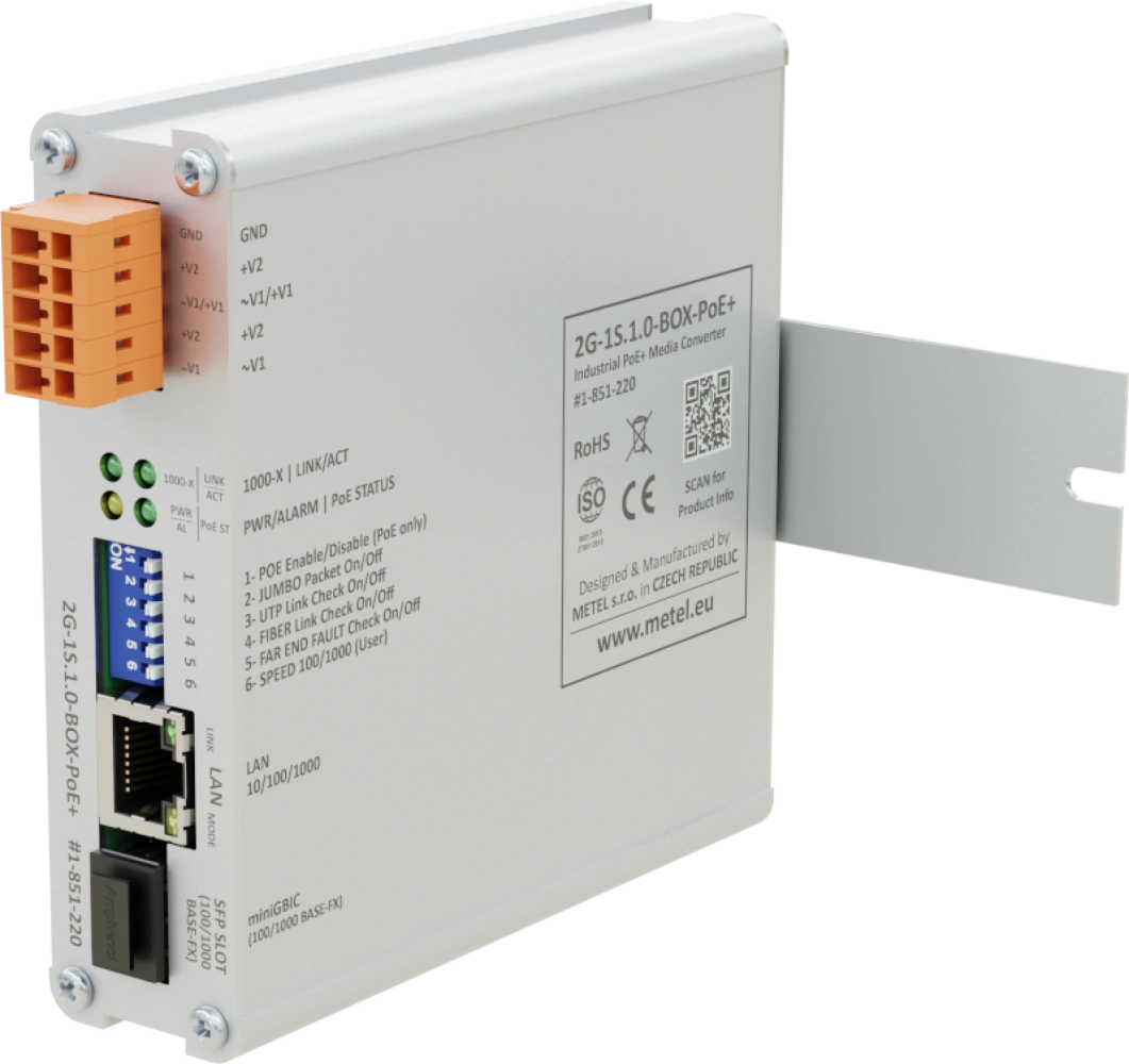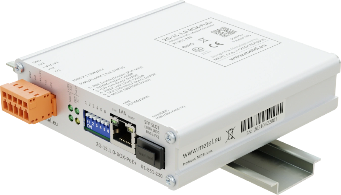 Przemysłowy konwerter mediów z obsługą PoE+ (25,5 W), gniazdo SFP z obsługą 100/1000BASE-X, obsługa FAR END FAULT, obsługa pakietów JUMBO, wykrywanie odłączenia kabla optycznego/FTP, ochrona przeciwprzepięciowa 30 A