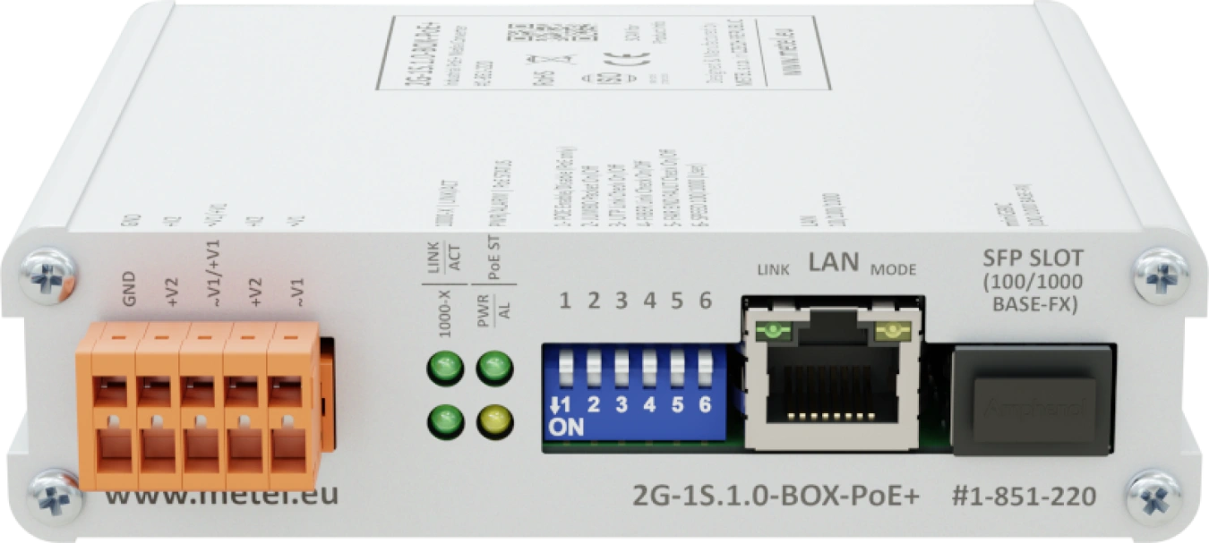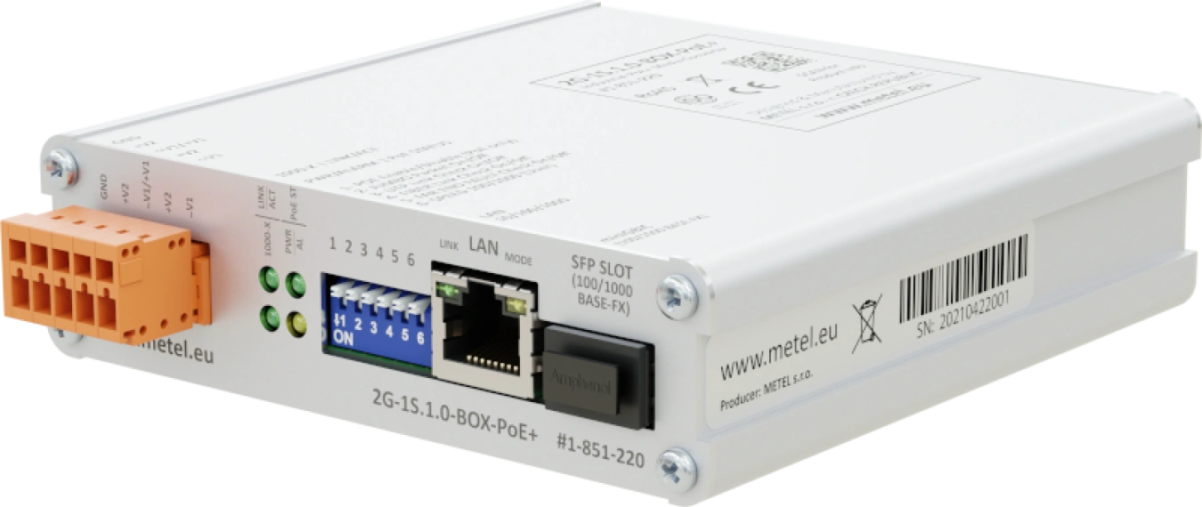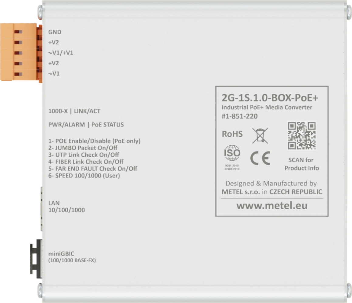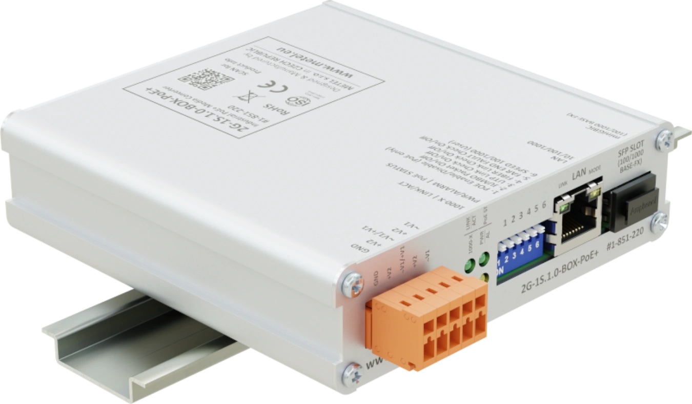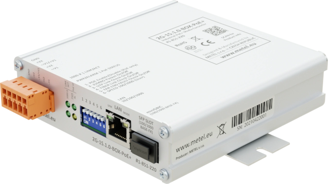 Przemysłowy konwerter mediów z obsługą PoE+ (25,5 W), gniazdo SFP z obsługą 100/1000BASE-X, obsługa FAR END FAULT, obsługa pakietów JUMBO, wykrywanie odłączenia kabla optycznego/FTP, ochrona przeciwprzepięciowa 30 A