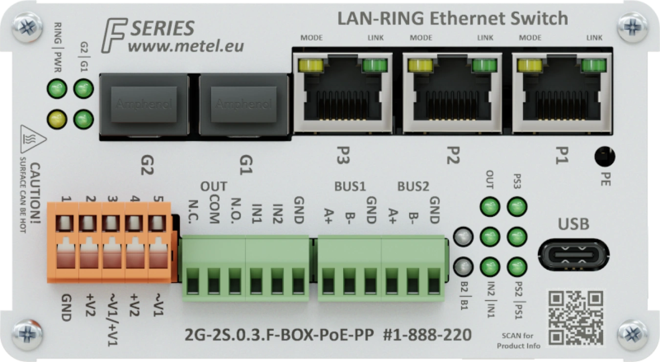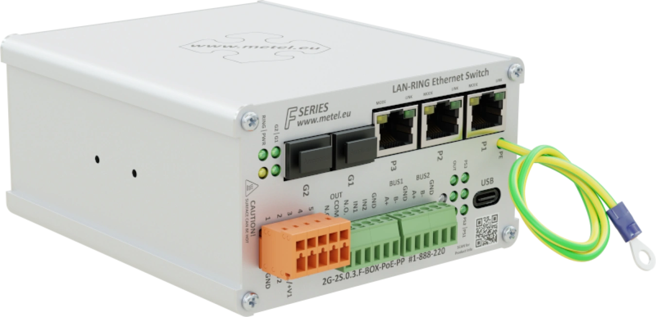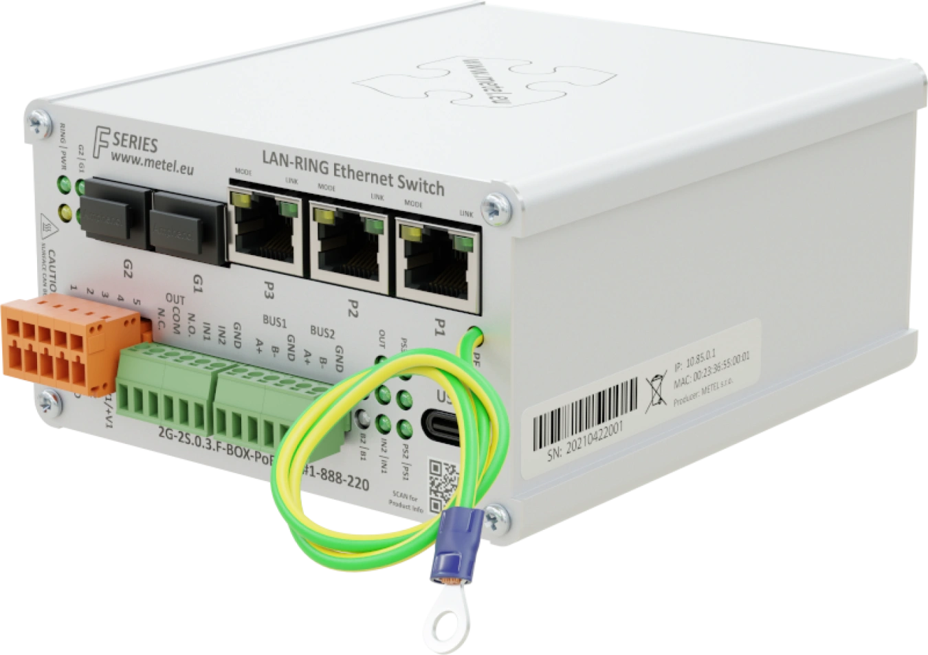 Switch industriale per topologia circolare con 2x slot SFP, 3x porta Fast Ethernet con PoE, supporto UPOE, POH, 802.3af/at/bt, max. 95W per porta, consumo massimo totale PoE su tutte le porte 150W, 2x DI con supporto loop bilanciato, 1x uscita NO/NC RELAY programmabile, 2x RS485/1x RS422 BUS (supporto modulo MODBUS, server TCP, modalità UDP), porta USB per gestione locale, ingresso di alimentazione ridondante, protezione da sovratensioni 150A, GESTIONE EVENTI. temperatura operativa -40...+75 °C, VLAN, QoS, SNMP, SMTP, SNTP, IGMPv1/2, RSTP, LLDP, 802.1X.