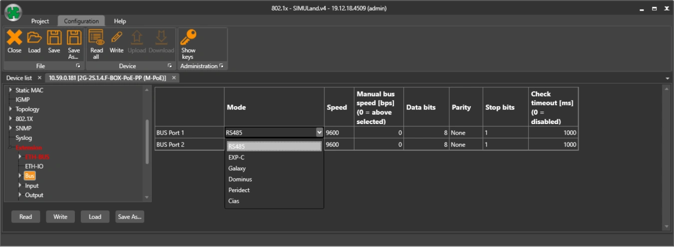 Selezionare la modalità di collegamento seriale corretta nel menu BUS. In modalità TCP, di solito si utilizzano le seguenti opzioni: