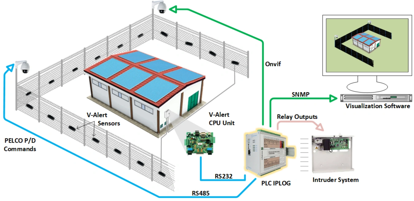 The protection of outdoor objects is a common application where you may encounter the IPLOG system. Examples of successful applications are the buildings of oil mines in South Moravia. Based on a request from our long-time customer, we have added function blocks to the tools available in the METEL IEC61131-3 IDE to directly support the V-Alert perimeter system, which communicates with the PLC via an RS232 serial line. V-Alert sends alarm and cut events from individual zones, which IPLOG receives and based on the created program sets/controls outputs, rotates cameras, sends emails, logs to database etc... Analog Pelco cameras are controlled via Pelco P/D protocols over RS485 bus and IP cameras via Onvif protocol directly over LAN.