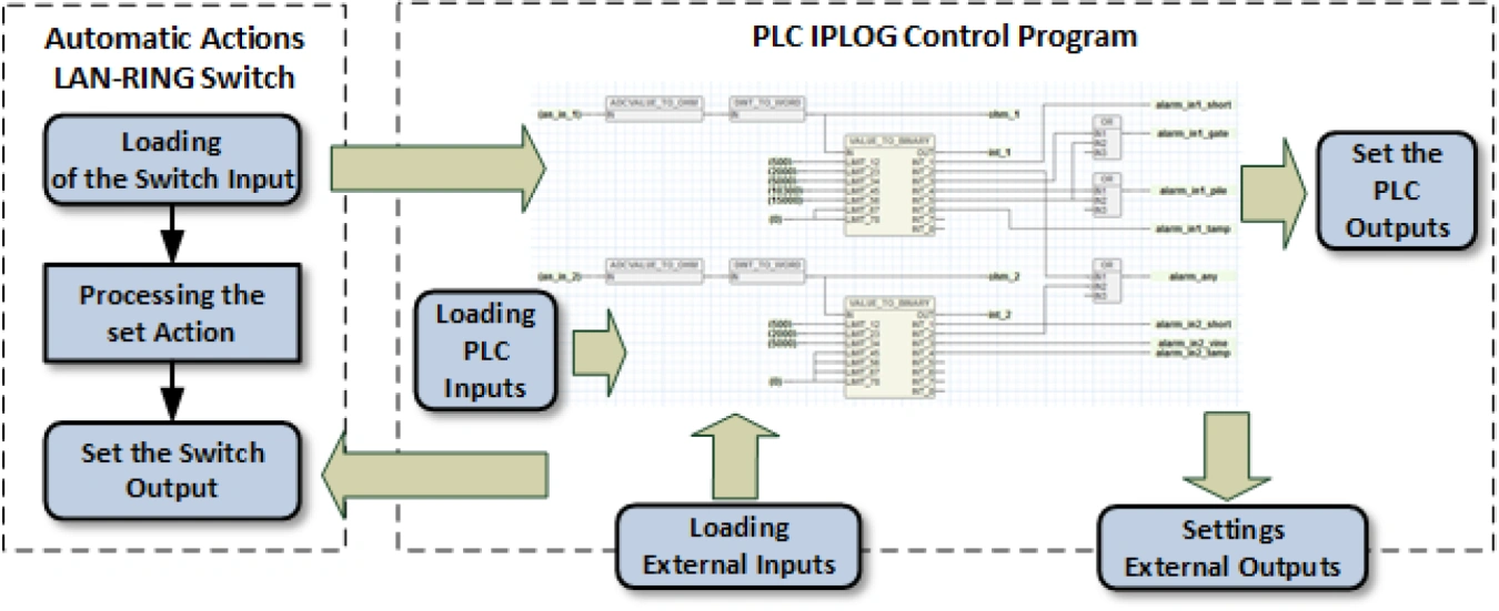 The connection of the LAN-RING industrial switch to the IPLOG-GAMA PLC enables even the most complex control actions.
