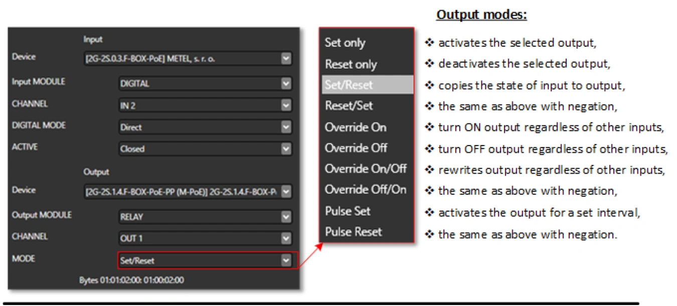 DIRECT - The status of the input is periodically copied to the set output. This mode is typically used to transfer the input state directly to the relay output(s). Digital input states can be transmitted to the local output(s) or, using the ETH option, to the output(s) of a remote device.