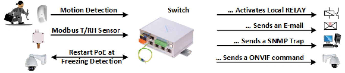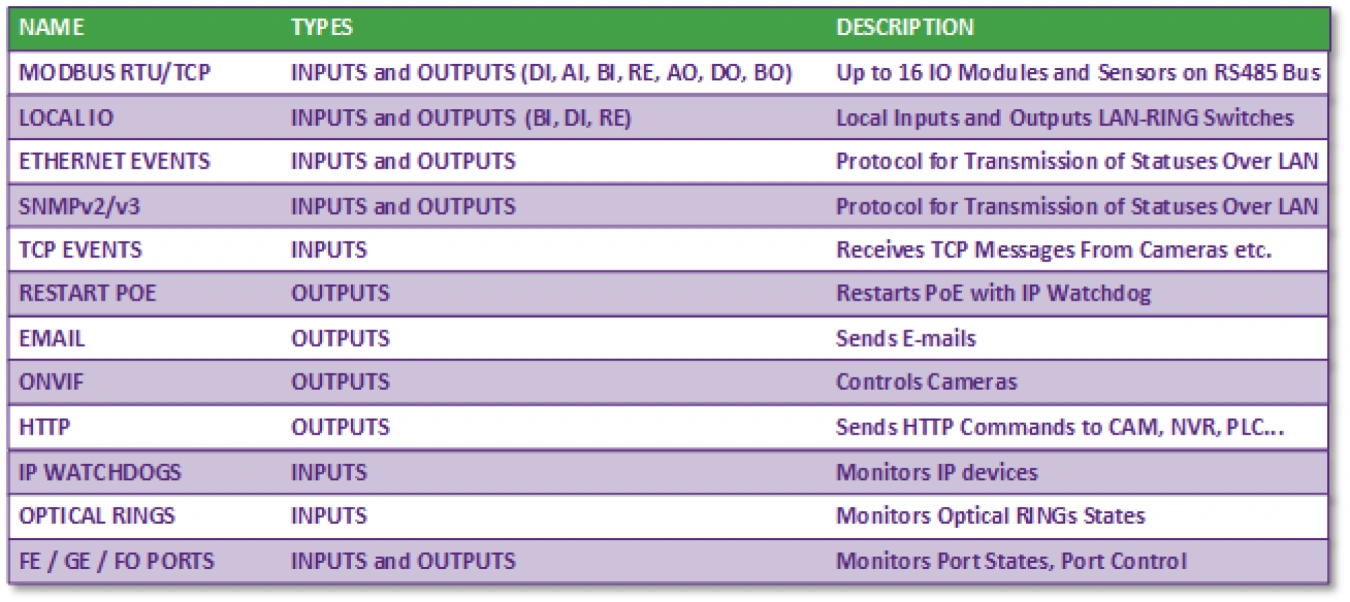 A unique set of tools in the EXTENSION menu of LAN-RING switches allows you to set up a variety of automatic actions independent of external software. The table below provides an overview of the supported inputs and outputs that can be used to set up automatic actions.