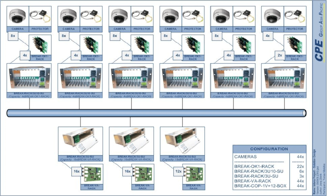 Dodali jsme přenosové zařízení pro 135 kamer propojených koaxiálními kabely o délce 1800 m.