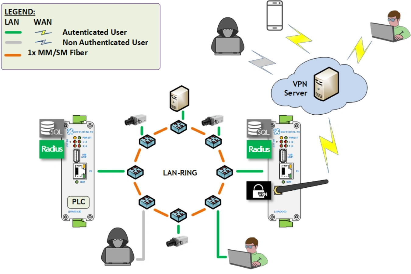 The open concept of the IPLOG-GAMA controllers allows customers to flexibly extend the production software with additional useful tools. Typical examples are the software packages described below for deployment, for example, in critical infrastructure facilities. IPLOG-GAMA controllers connected to the LAN-RING network infrastructure provide a comprehensive solution for authenticating network infrastructure users, logging configuration changes to network elements, providing encrypted VPN tunnel connectivity and other useful functions.