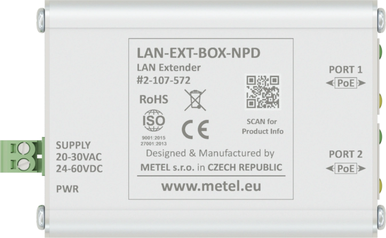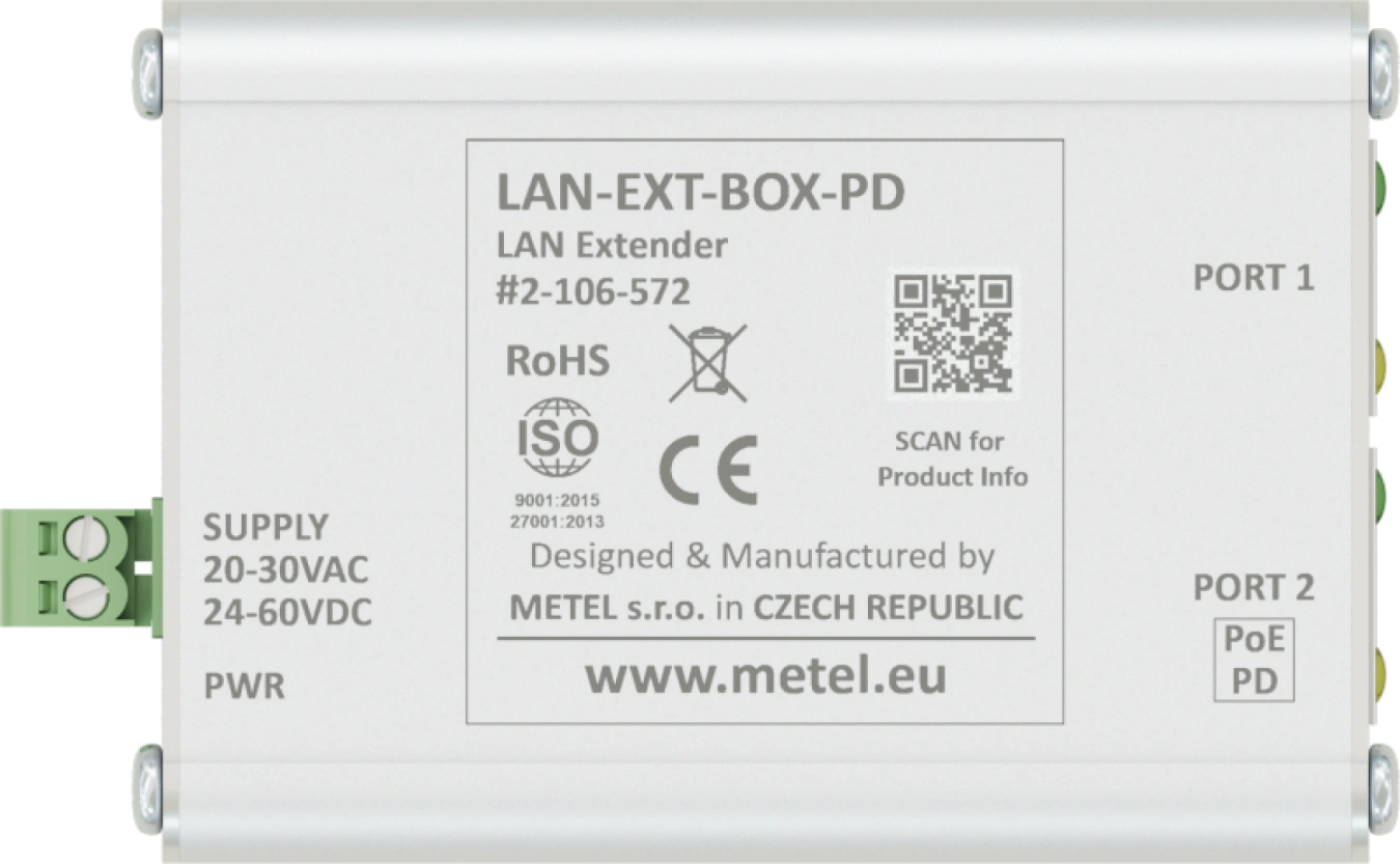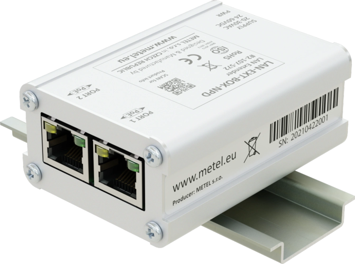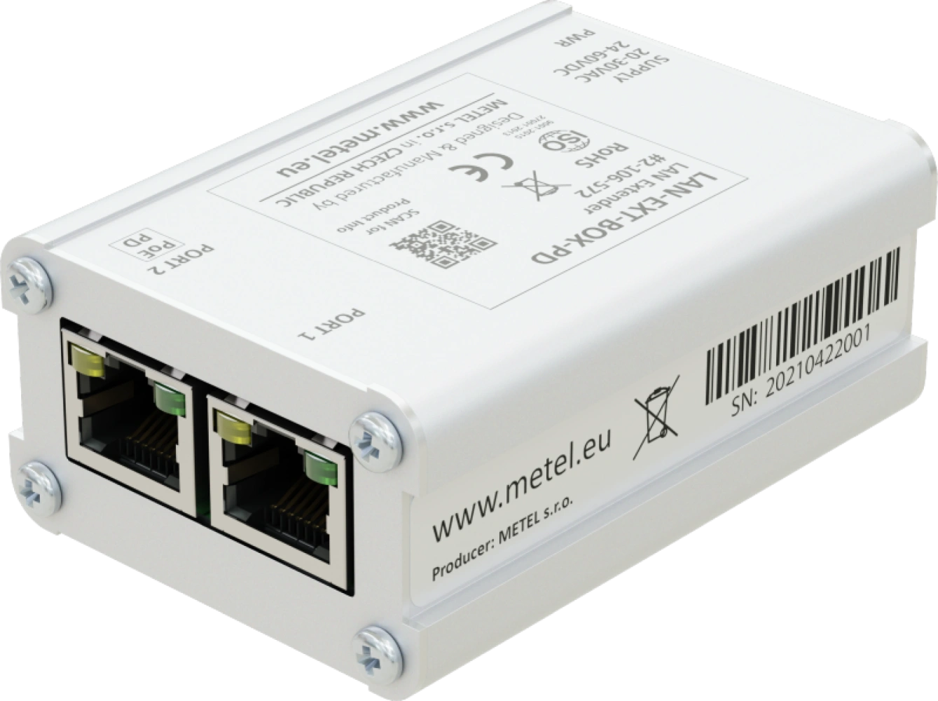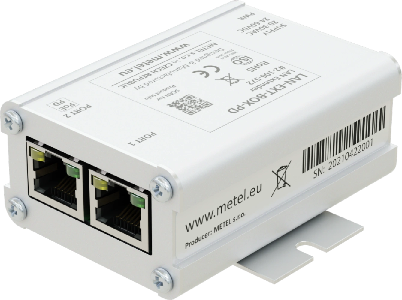 LAN extender suitable for LAN extension by 100m. It guarantees 100Mbps throughput in full duplex mode over the entire length of the transmission. The extender includes PoE-PD (power device), a circuit supporting standard detection and classification mechanisms according to IEEE 802.3af and IEEE 802.3at standards.