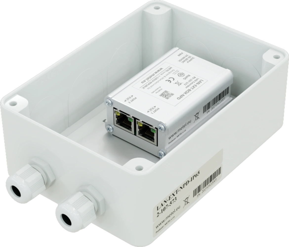 LAN and PoE extender, suitable for extending LAN and PoE by 100m. In case of using 2 pieces, it extends LAN and PoE up to 300m. In the entire length of transmission guarantees a throughput of 100Mbps in full duplex mode. After connecting a switch / injector with PoE support according to IEEE 802.3af or IEEE 802.3at standards, the extender waits for the moment when the end PoE PD device (camera, sensor) is detected and classified. After that, it turns on and begins to leak data. Power supply via PoE only, 2x PG9 grommet