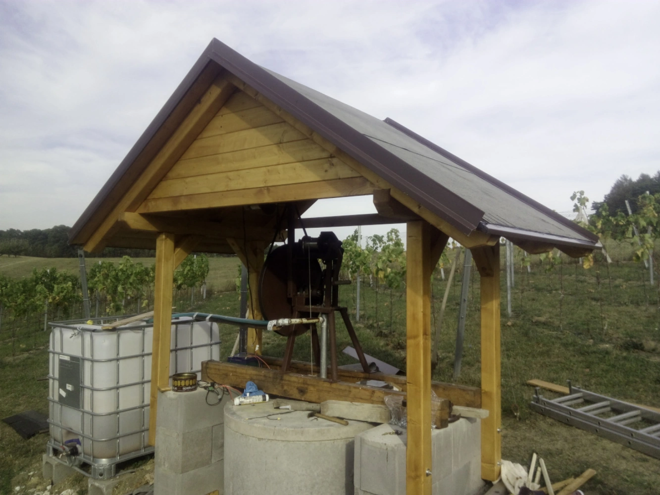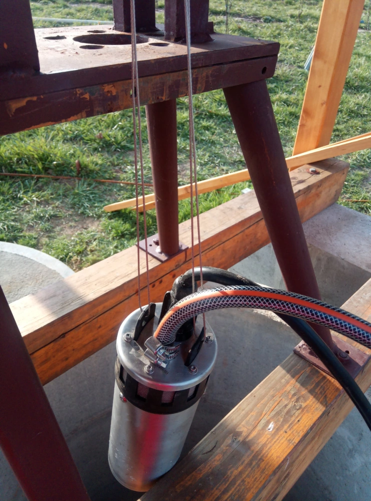 After the completion of the borehole, we continued with the construction of the canopy and not very successful tests of the pump driven by a 12V electric motor. The pump was not efficient and reliable enough for the water level of around 33m.