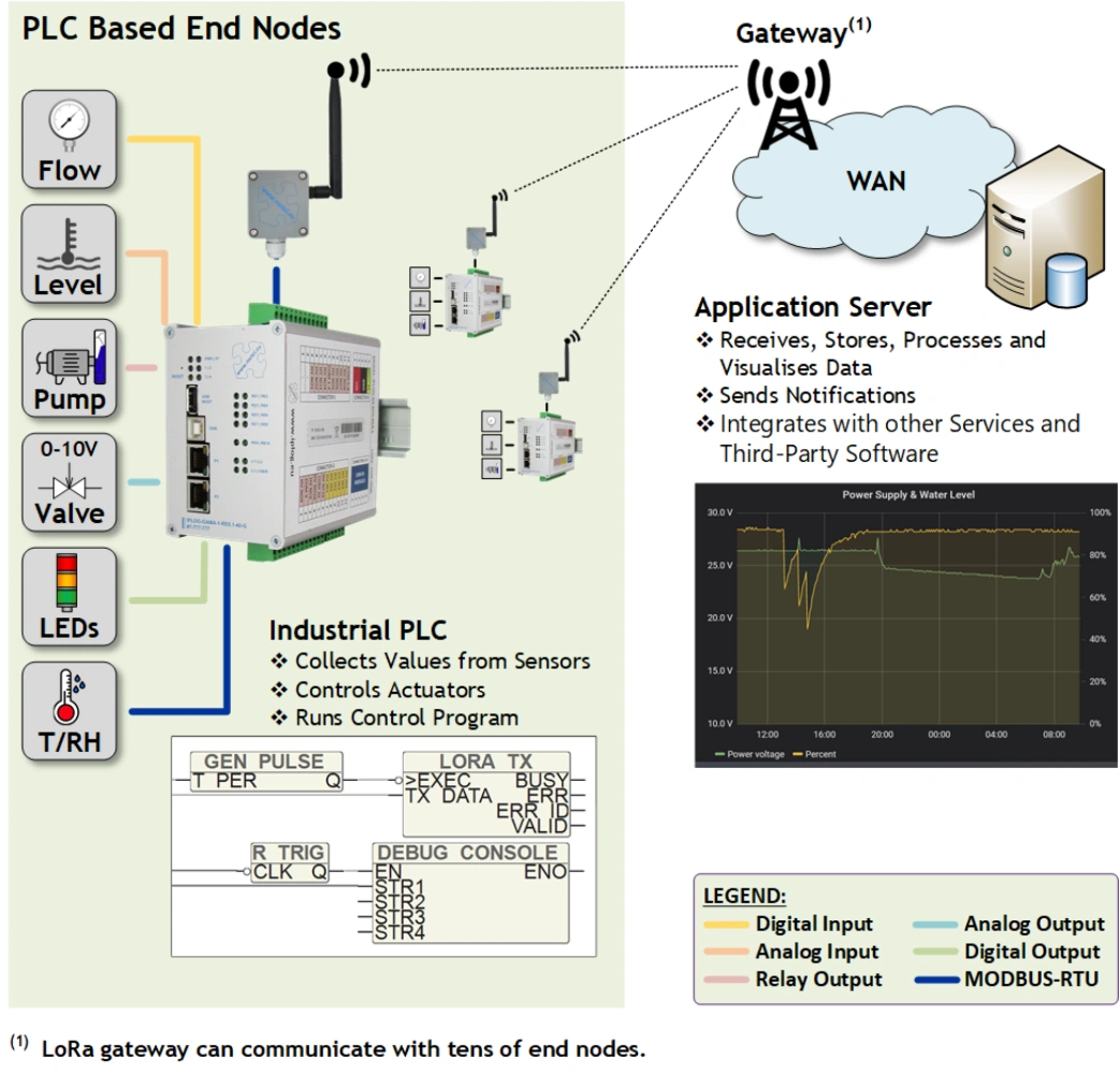 LoRaWAN devices have a "duty cycle" limitation of 1%, which does not allow real-time communication and especially real-time remote control. Our endpoints based on IPLOG-GAMA modular PLCs largely eliminate this shortcoming. The PLC runs the control program independently of the central server and only the necessary data for visualization, logging and operator feedback is transmitted via the LoRaWAN. Typical application examples are alarm systems for monitoring remote areas, collecting data from weather stations, controlling water pumping from wells, etc.