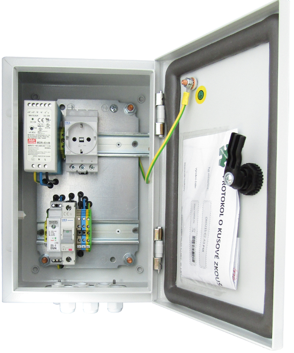 Quadro da esterno in acciaio con protezione IP66. Il quadro è dotato dei seguenti componenti: presa 230VAC tipo E (CZ), alimentazione 12VDC/40W, protezione contro le sovratensioni di 3° grado, interruttore 2A, dimensioni: 300x200x150 mm