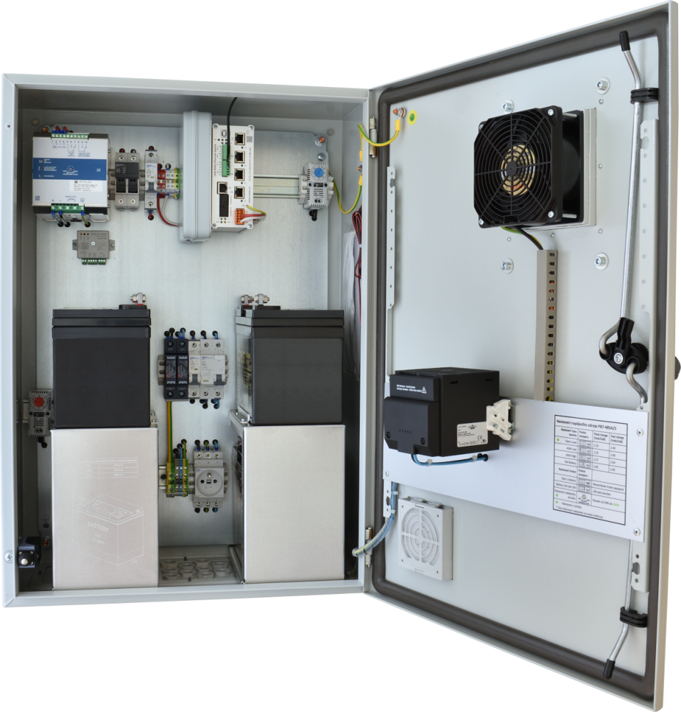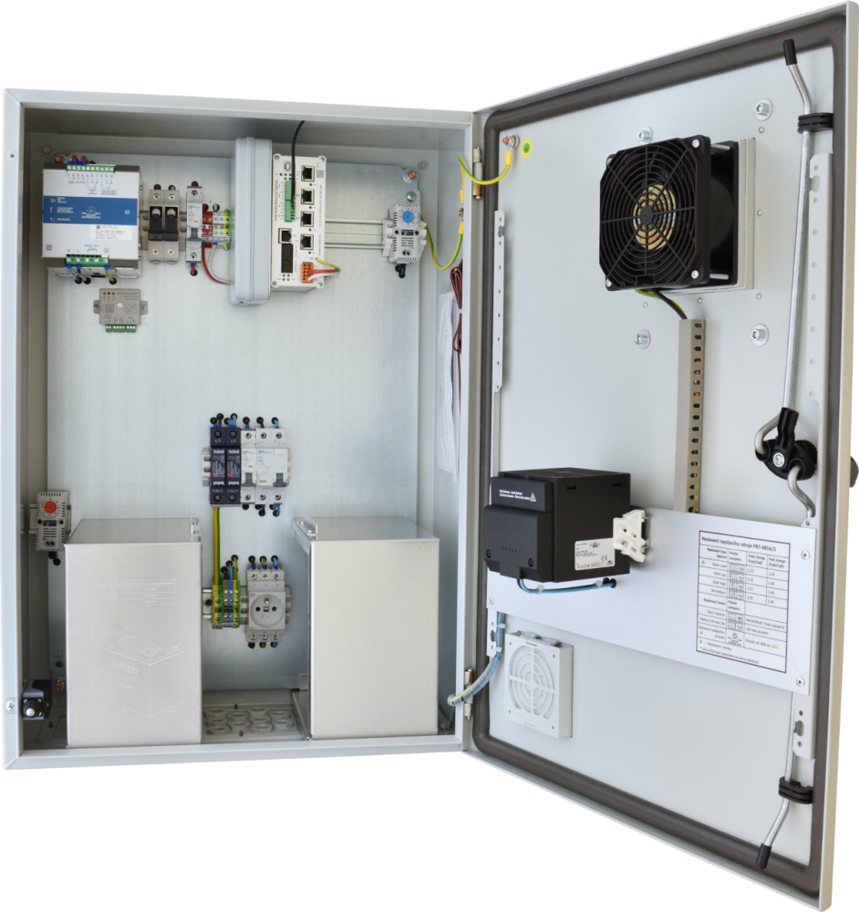 Quadro da esterno in acciaio con spazio per batterie di backup. Il quadro soddisfa i requisiti della norma EN 61439-1 (certificato da TUV SUD) ed è ottimizzato in particolare per le installazioni all'esterno di interruttori industriali, PLC e moduli METEL IO. Il quadro può essere equipaggiato anche con dispositivi di altri produttori. Il quadro è dotato dei seguenti componenti: presa 230VAC di tipo E (CZ), alimentazione di riserva 48VDC/240W, limitatore di sovratensione 1° + 2° stadio, interruttore automatico 10A, protettore di corrente, dimensioni: 700x500x250 mm.