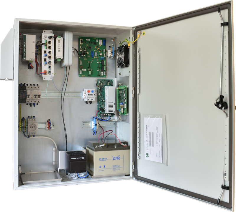 Quadro da esterno in acciaio con spazio per la batteria di backup. Conforme ai requisiti della norma EN 61439-1 (certificata dal TUV SUD), il quadro è ottimizzato per l'installazione all'esterno di interruttori industriali, PLC e moduli IO METEL. Il quadro può essere equipaggiato anche con dispositivi di altri produttori. Il quadro è dotato dei seguenti componenti: presa di corrente 230VAC tipo F (DE), alimentatore 12VDC/120W, limitatore di sovratensione 1° + 2° stadio, interruttore automatico 4A, protettore di corrente, dimensioni: 800x600x250 mm