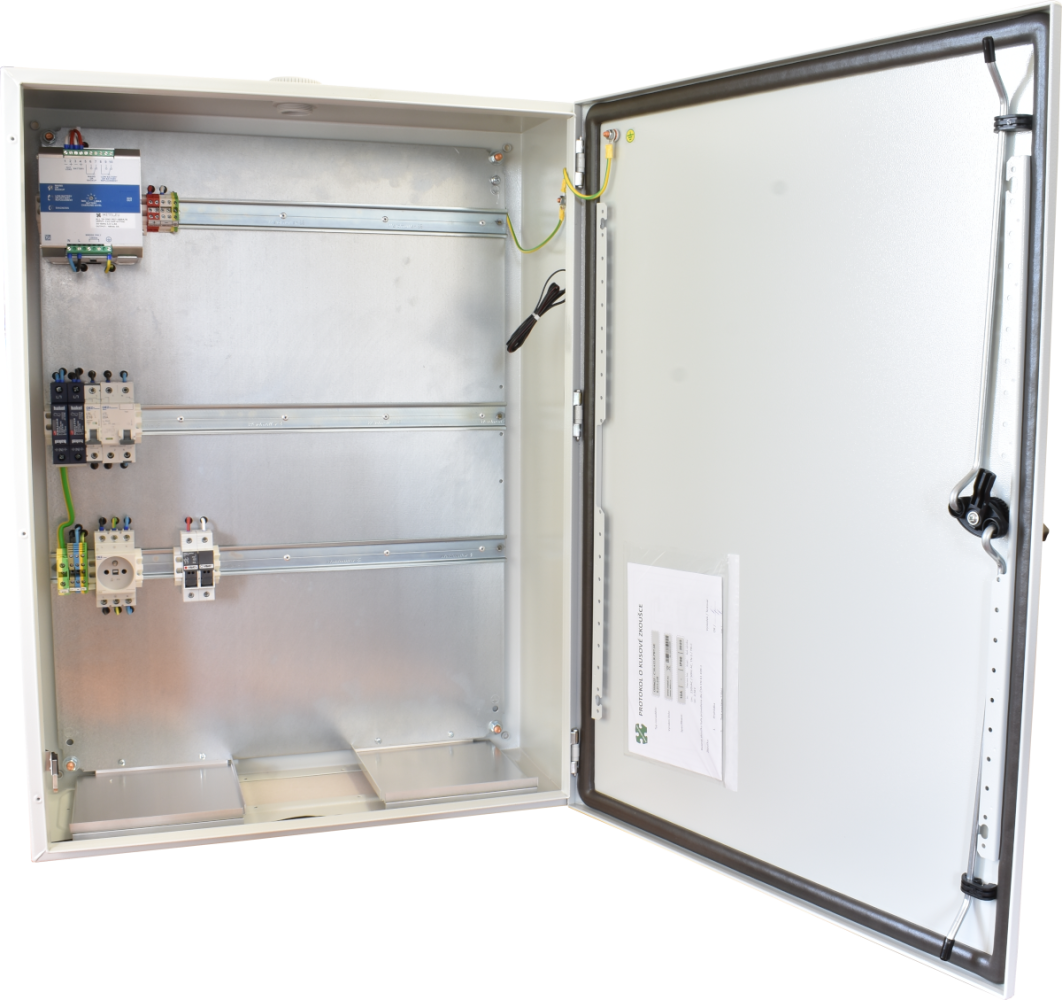 Quadro da esterno in acciaio con spazio per la batteria di backup. Conforme ai requisiti della norma EN 61439-1 (certificata dal TUV SUD), il quadro è ottimizzato per l'installazione all'esterno di interruttori industriali, PLC e moduli IO METEL. Il quadro può essere equipaggiato anche con dispositivi di altri produttori. Il quadro è dotato dei seguenti componenti: Presa 230VAC tipo E (CZ), alimentatore 24VDC/120W, limitatore di sovratensione 1° + 2° stadio, interruttore automatico 4A, protettore di corrente, dimensioni: 800x600x250 mm