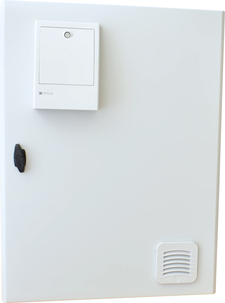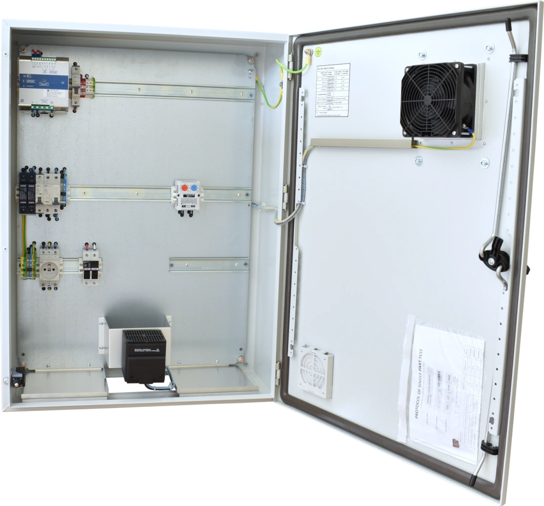 Quadro da esterno in acciaio con spazio per una batteria di backup. Il quadro è conforme alla norma EN 61439-1 (certificato da TUV SUD) ed è ottimizzato in particolare per l'installazione all'esterno di interruttori industriali, PLC e moduli METEL IO. Il quadro può essere equipaggiato anche con dispositivi di altri produttori. Il quadro è dotato dei seguenti componenti: presa 230VAC tipo F (DE), alimentazione di backup 48VDC/240W, limitatore di sovratensione 1° + 2° stadio, interruttore automatico 10A, protettore di corrente, dimensioni: 800x600x250 mm