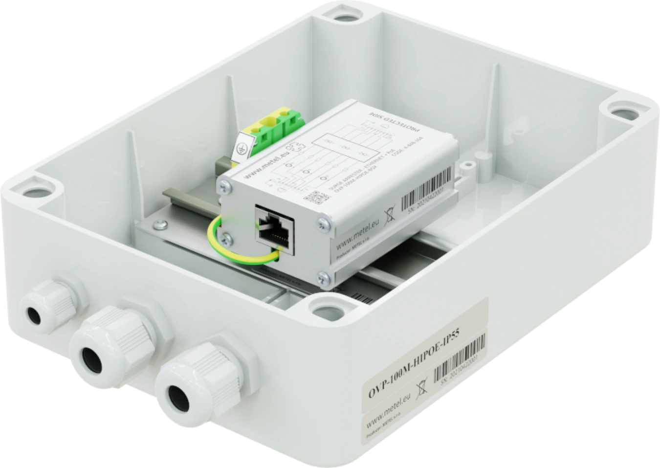 Limitatore di sovratensione 10/100M Ethernet + PoE A/B o HIPoE (max. 90W), struttura a due stadi, terminale PE isolato galvanicamente, installazione in scatola di plastica con coperchio IP 55.