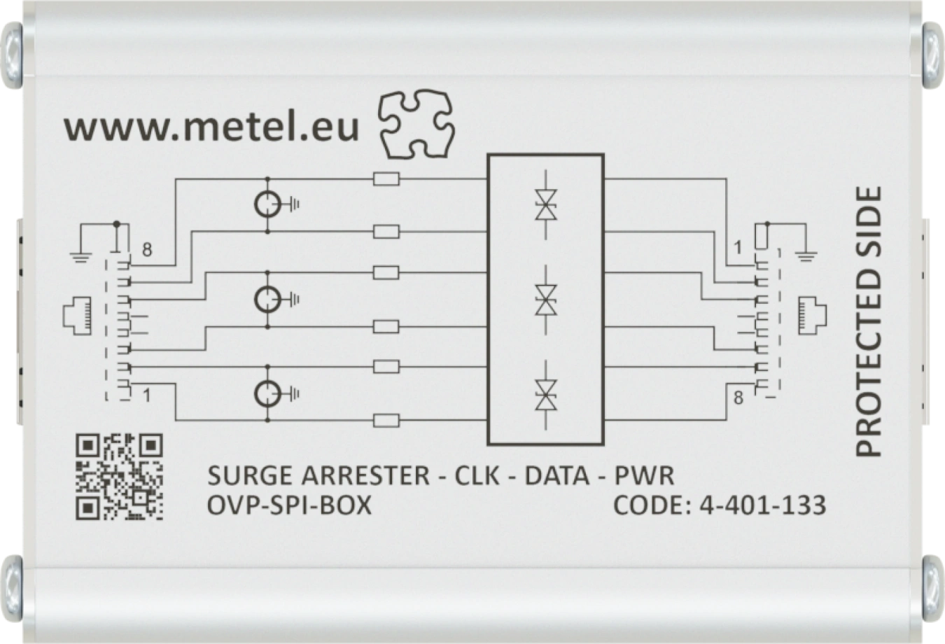 The surge protector is designed to protect the differential SPI control of LED lights of the T-REX QUADRIS system. It is connected to the UTP Cat.5 cable between the control unit (T-REX QUADRIS) and the SPI converter DDS1200.