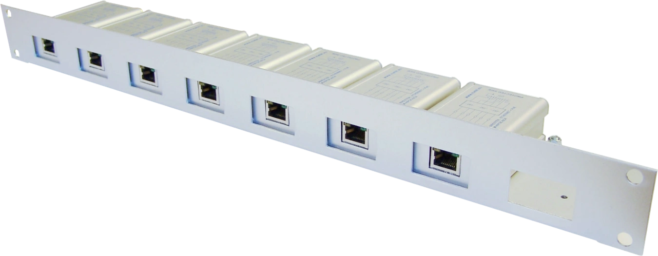 Pannelli patch progettati per l'installazione rapida e professionale di un massimo di 8 limitatori di sovratensione Gigabit Ethernet (OVP-1000M-BOX), Fast Ethernet (OVP-100M-BOX) e Fast Ethernet con PoE++ (OVP-100M-HIPOE-BOX) in rack da 19".