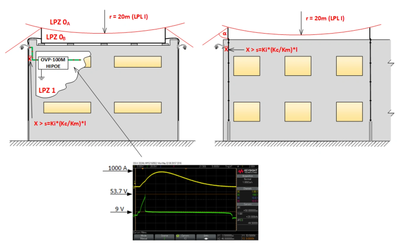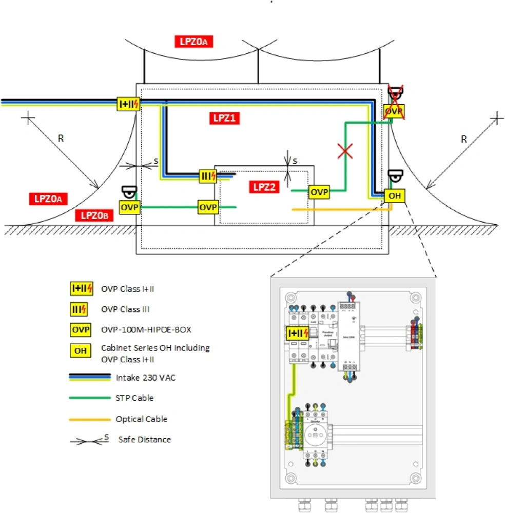 In base alla classificazione della classe dell'edificio, si determina come deve essere dimensionata la protezione contro i fulmini dell'edificio. In particolare, nelle applicazioni tipiche delle nostre strutture, è necessario garantire che il sistema protetto sia installato all'interno della LPZ 1 o superiore (EN 62305-1, paragrafo 8.4.2). Ciò si ottiene installando interruttori, PLC e moduli IO in quadri di acciaio delle serie OH4320, OH6425, OH8625. Il quadro stesso può essere installato nella zona LPZ0B.