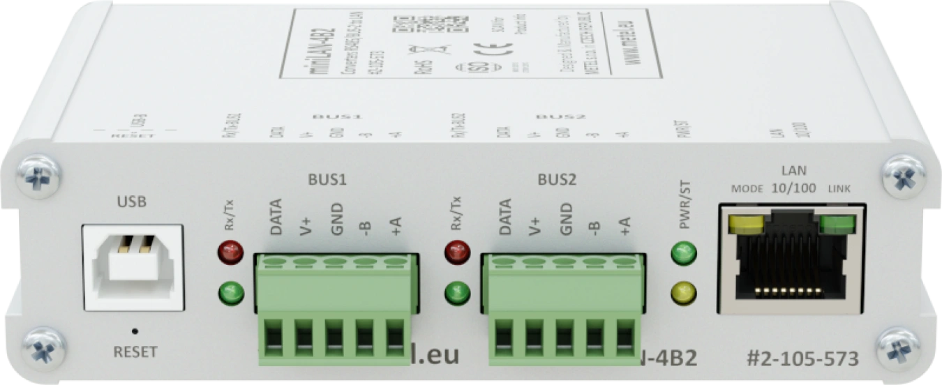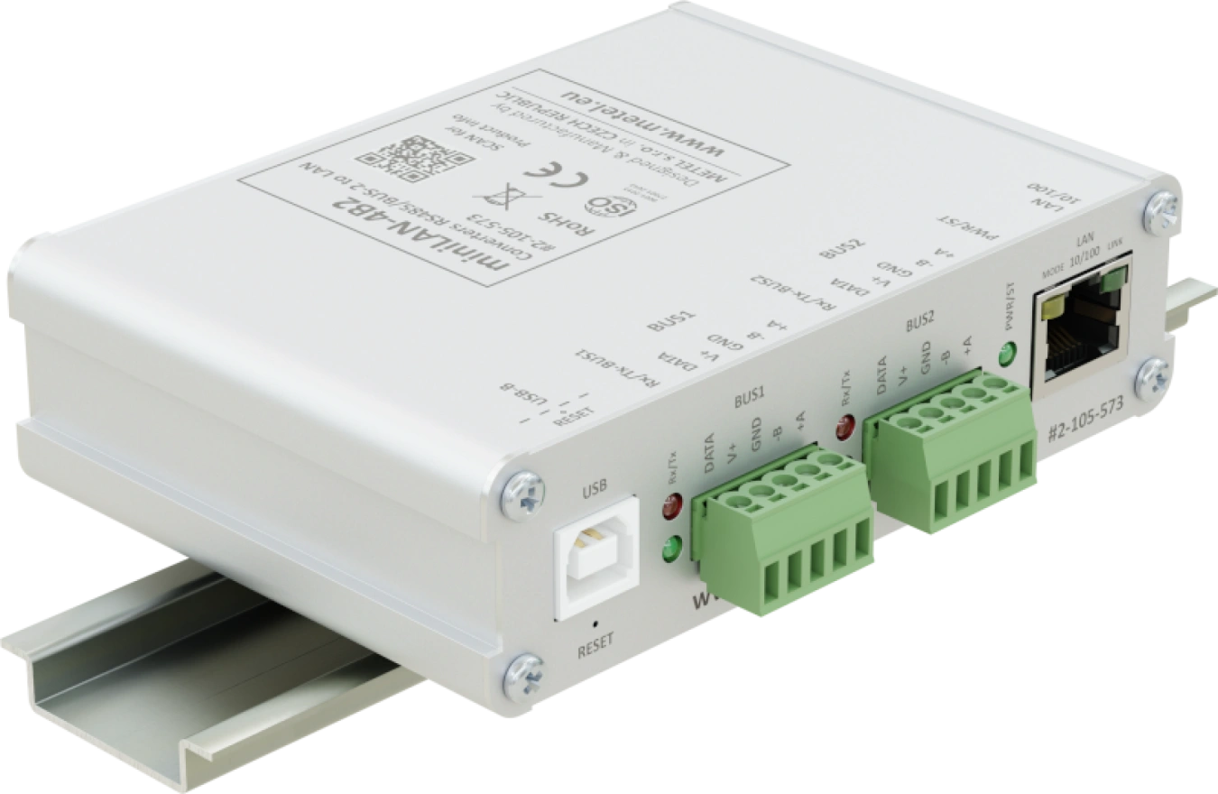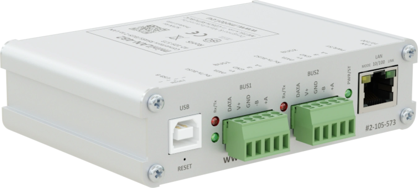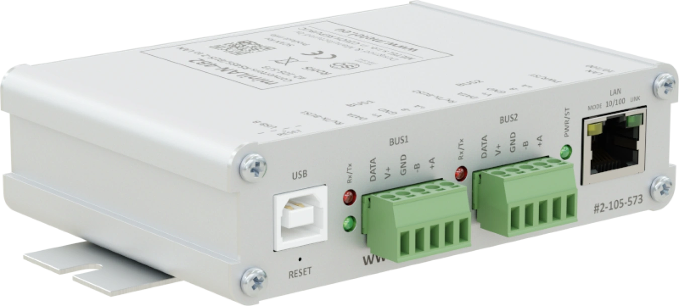 Dual channel RS485/BUS-2 to LAN converters.1x Ethernet port, 2x RS485/BUS-2 bus, Modbus RTU/TCP, TCP-server/TCP-client, LAN/RS port conversion speed from 3 ms, 600W surge protection for all ports, encrypted SNMPv3 management, operating temperature from -40°C to +70°C.