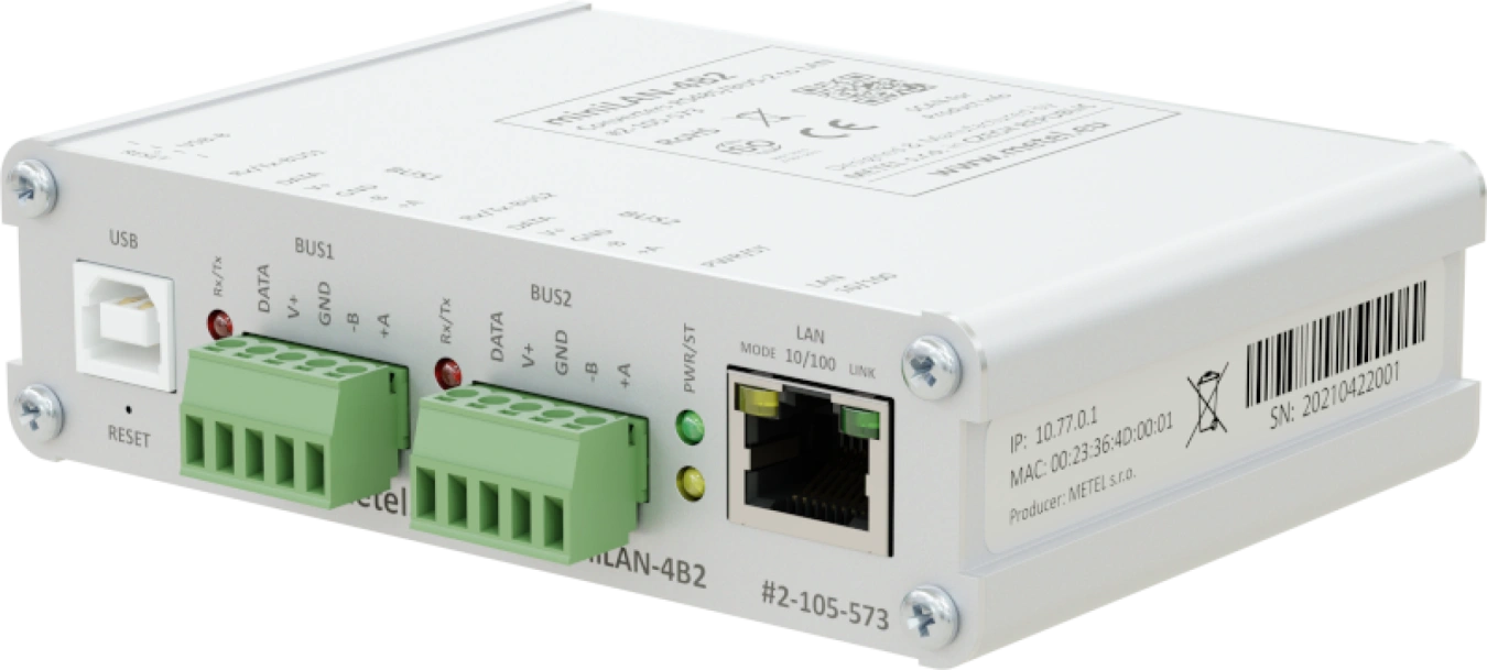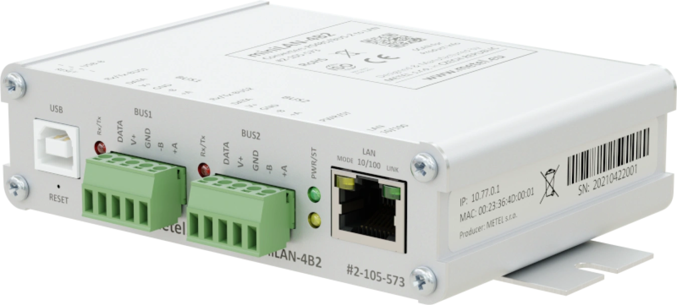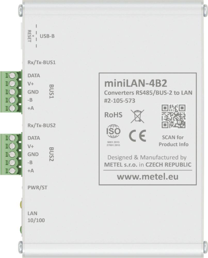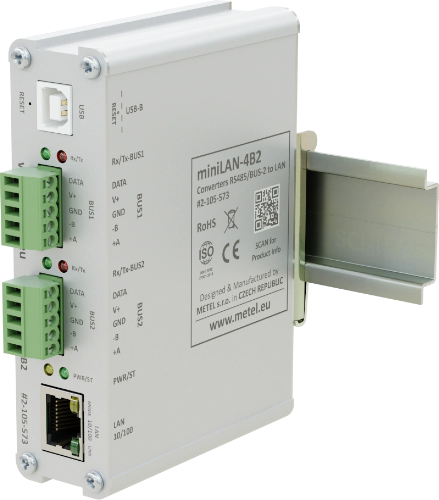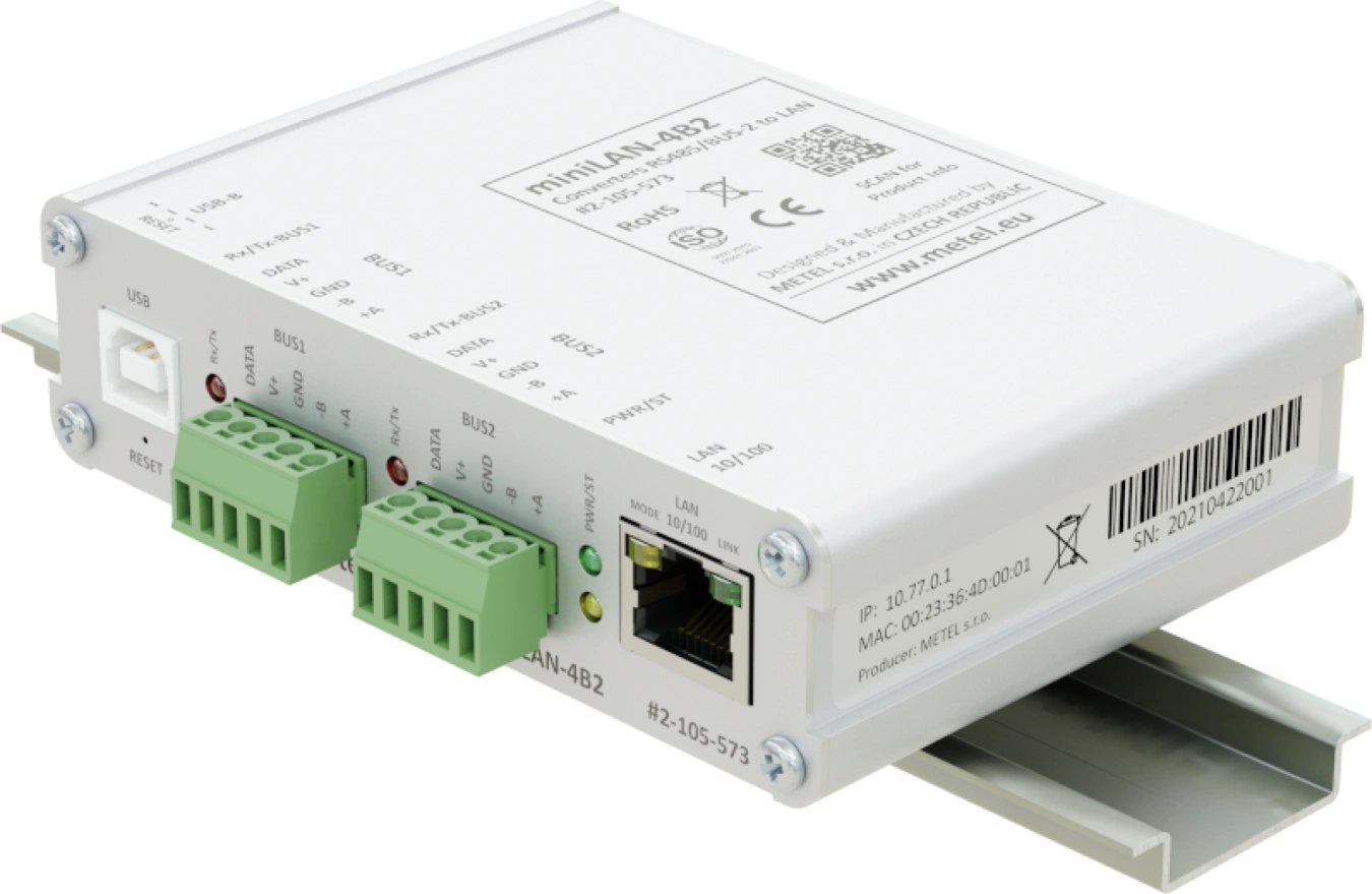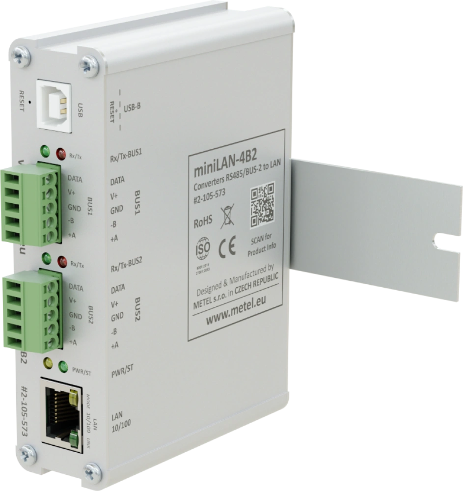 Dual channel RS485 and BUS-2 serial to LAN converters. The converters support Modbus RTU/TCP protocols (TCP-server and client). The converters are also compatible with ASSET, Galaxy Dimension and MB-Secure alarm systems. Valid certificates confirming compatibility with CSN 50131-1 are available for download on our website.