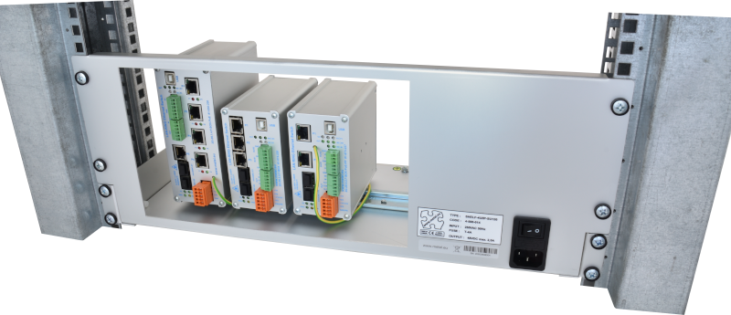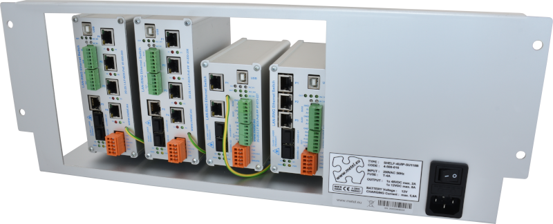 The 19" SHELF-4U/IP-SU racks are designed for fast and professional mounting of industrial LAN-RING switches and media converters in 19" racks. Included are guides to allow partial or complete removal of the shelf from the 19" rack.