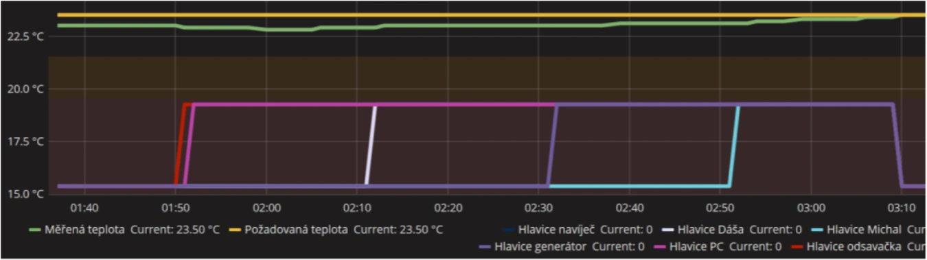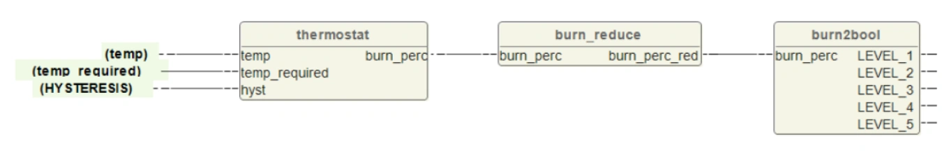 L'uscita del blocco termostato generale viene ulteriormente ricalcolata dalla percentuale dal blocco burn_reduce. Se non si verifica la risposta attesa sotto forma di aumento della temperatura nell'ambiente, il blocco burn_reduce esegue una correzione del calcolo. Il risultato è un'ulteriore accensione di uno o più radiatori. Le percentuali calcolate dal blocco burn_reduce vengono convertite dal blocco burn2bool nel numero di radiatori da riscaldare.