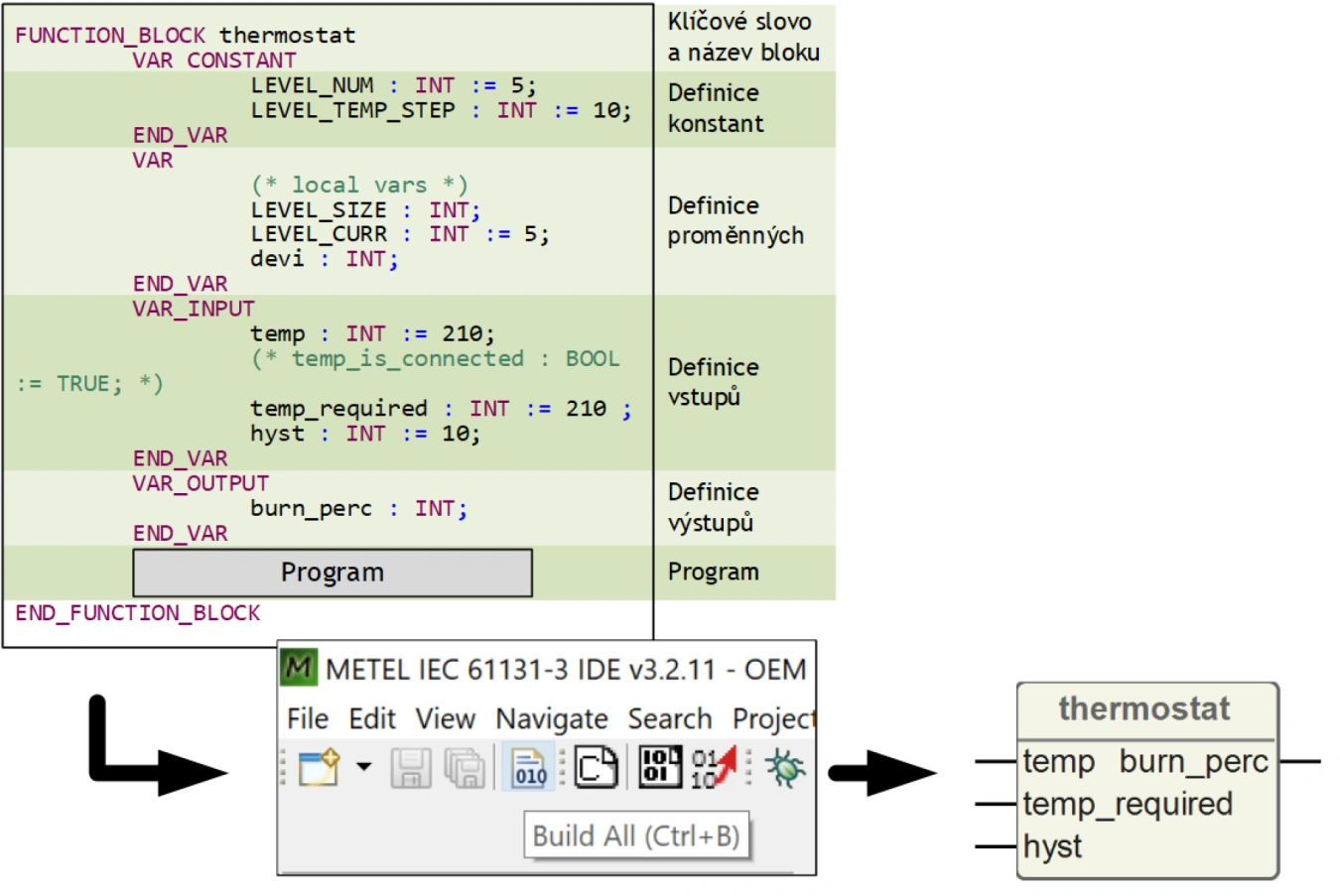 La sfida successiva è stata il programma stesso. Inoltre, il software di programmazione METEL IDE con centinaia di funzioni definite nello standard IEC61131-3 consente di preparare blocchi personalizzati ottimizzati per un lavoro specifico. Il motivo principale della creazione di blocchi funzione personalizzati è anche quello di ridurre il tempo di compilazione di un programma complesso a partire da un gran numero di funzioni di base. Per creare un blocco, è sufficiente inserire la parola chiave FUNCTION_BLOCK con il nome desiderato all'inizio del programma in linguaggio ST, definire costanti, variabili, ingressi, uscite e terminare il programma con la parola chiave END FUNCTION_BLOCK. Facendo clic su Build all si genera quindi un blocco funzione da utilizzare successivamente nel linguaggio grafico FB. Nel nostro progetto, abbiamo utilizzato questa procedura per creare un blocco funzione termostato con gli ingressi temp (temperatura misurata), temp_required (temperatura target) e hyst (isteresi). In base ai valori correnti degli ingressi, viene calcolata la percentuale di uscita (quanto riscaldare).
