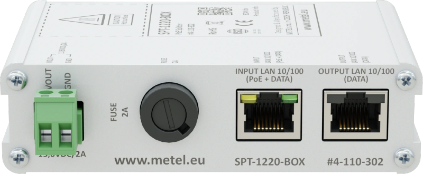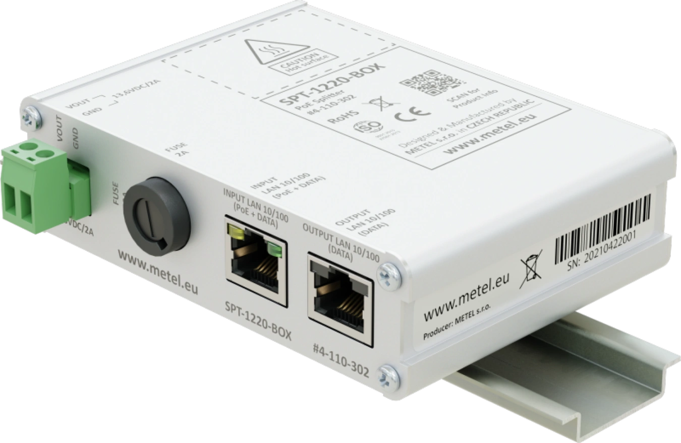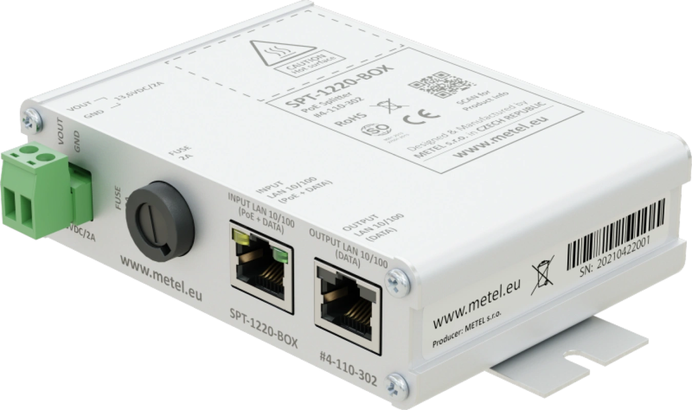 Rozgałęźniki zapewniają zasilanie 13,6 V / maks. 2 A z PoE+/++ zgodnie z IEEE802.3at/bt. Po podłączeniu do źródła PoE, splitter jest wykrywany i klasyfikowany przez urządzenie PoE-PSE (switch, injector). Wyjście 13,6 VDC / maks. 2 A jest następnie automatycznie aktywowane i wyzwalane. Typowe przykłady to zasilanie barier SICURIT IP Native, IPLOG, oświetlenia IR lub zewnętrznych mikrofonów.