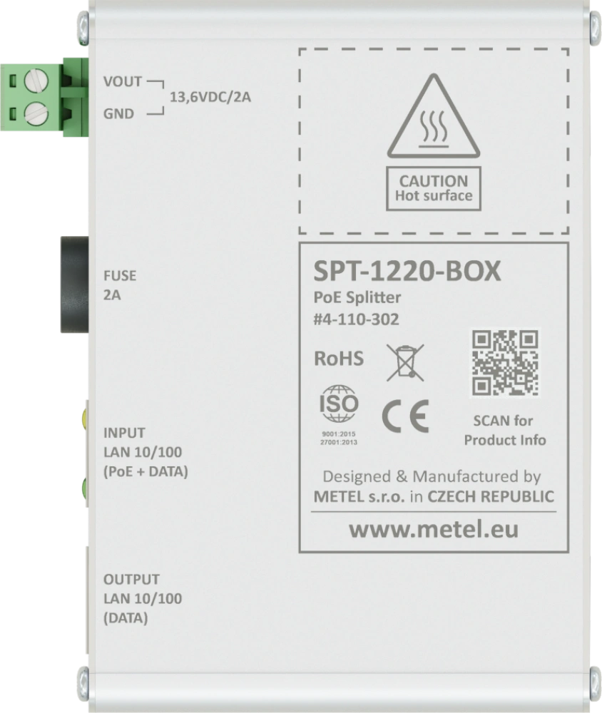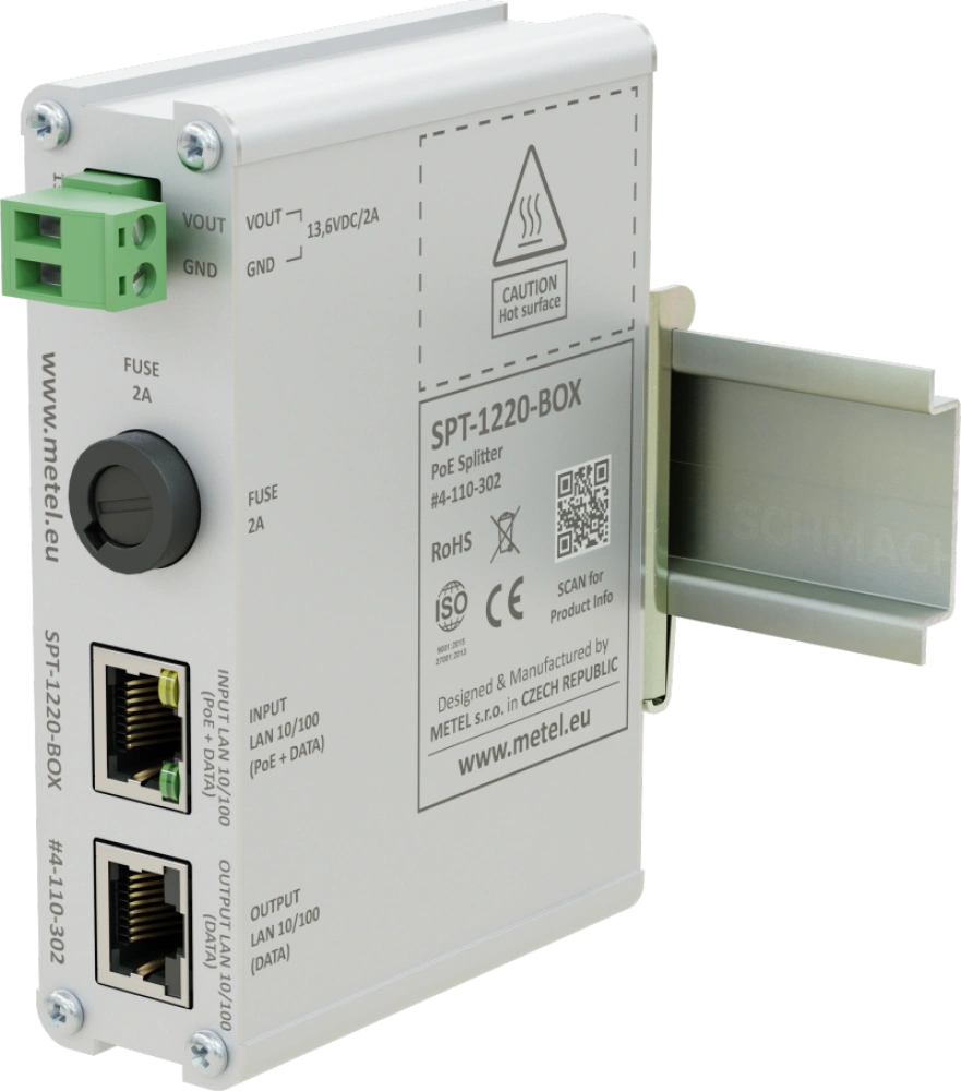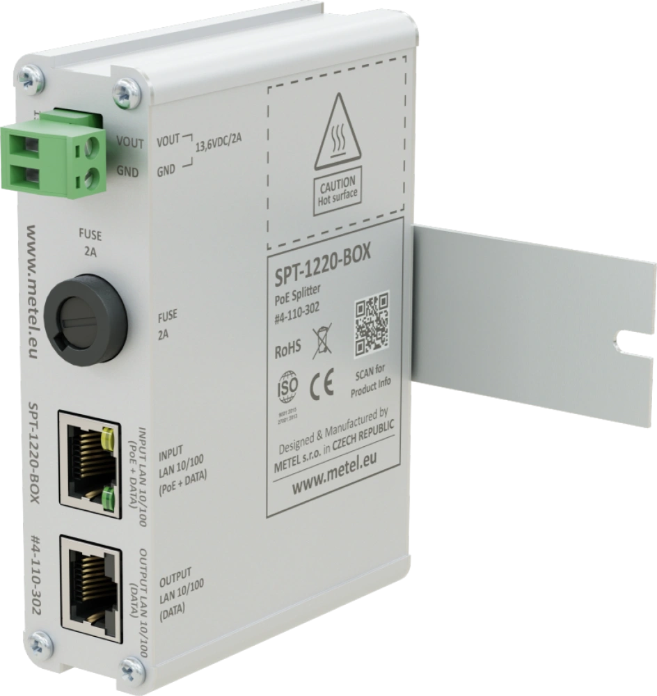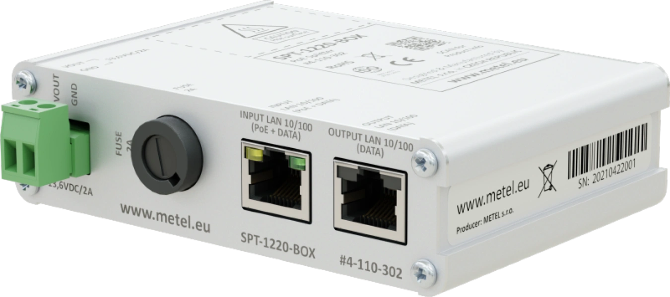 Rozgałęźniki zapewniają zasilanie 13,6 V / maks. 2 A z PoE+/++ zgodnie z IEEE802.3at/bt. Po podłączeniu do źródła PoE, splitter jest wykrywany i klasyfikowany przez urządzenie PoE-PSE (switch, injector). Wyjście 13,6 VDC / maks. 2 A jest następnie automatycznie aktywowane i wyzwalane. Typowe przykłady to zasilanie barier SICURIT IP Native, IPLOG, oświetlenia IR lub zewnętrznych mikrofonów.
