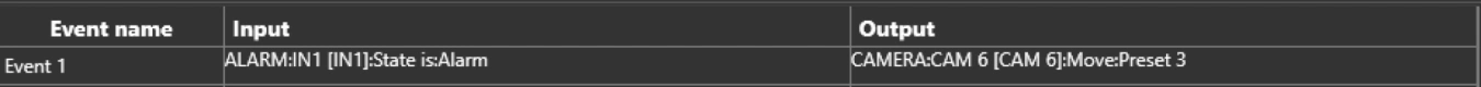 "Jeśli IN1 (ALARM=pętla alarmowa) jest w stanie ALARM, przełącz kamerę 6 na preset 3".