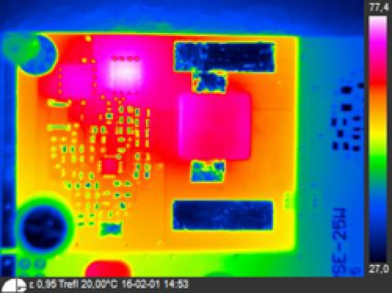 Utilizziamo la termografia soprattutto per la diagnostica preventiva dei circuiti stampati di nuova progettazione. Dopo che i prototipi sono stati montati e riportati in vita, un'ispezione con termocamera rivela i componenti e i collegamenti che presentano un riscaldamento eccessivo. Il grande vantaggio della termografia è la sua velocità e la mancanza di contatto. Se viene rilevato un riscaldamento indesiderato sul prototipo, apportiamo una correzione al progetto e ripetiamo il test. Questo garantisce che solo i dispositivi ben progettati entrino nella produzione di serie.