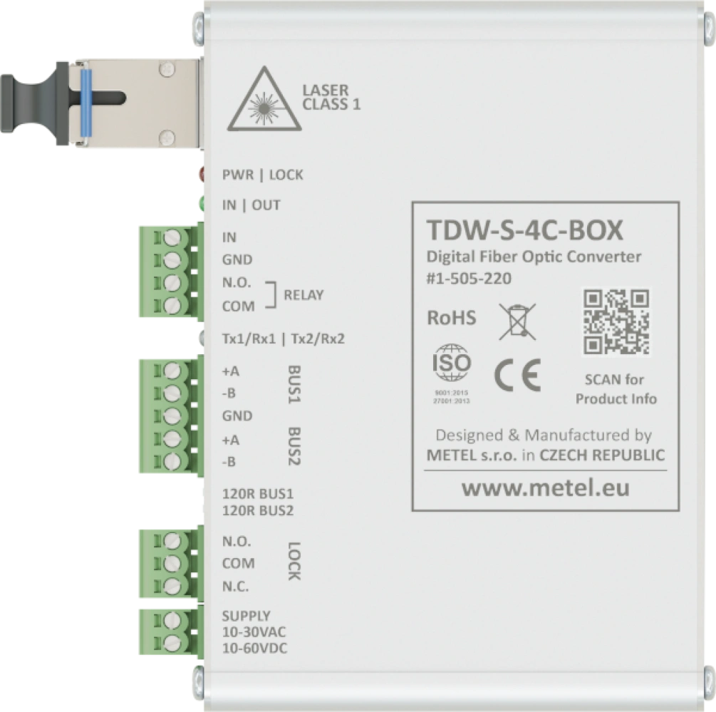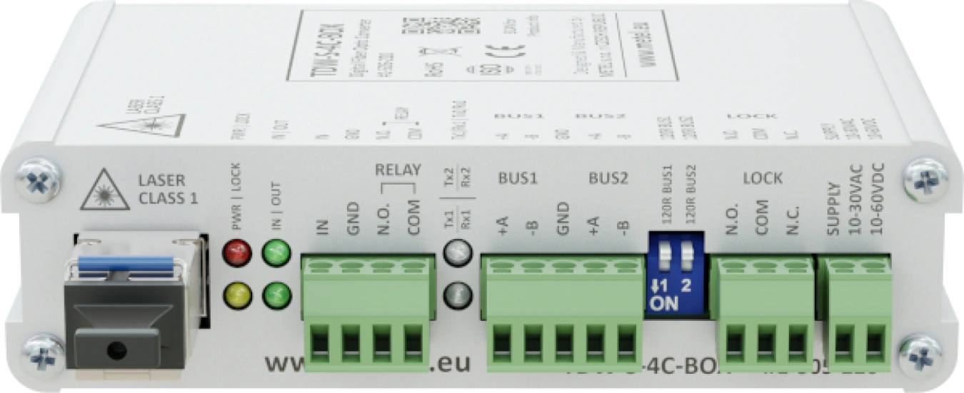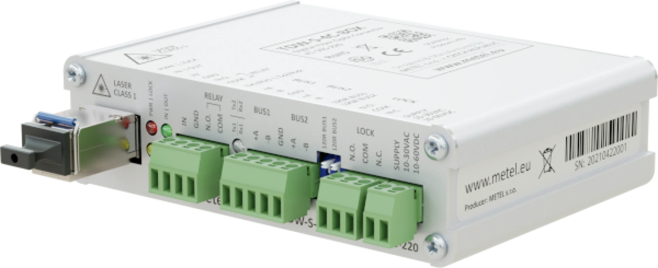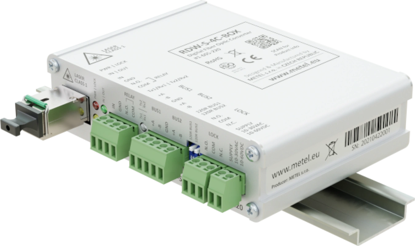 Przemysłowy transoptor cyfrowy - magistrala 2xRS485 lub 1xRS422, 1x styk dwukierunkowy i 1x przekaźnik LOCK do wykrywania przerwania światłowodu, awarii urządzenia przeciwnego i awarii zasilania.