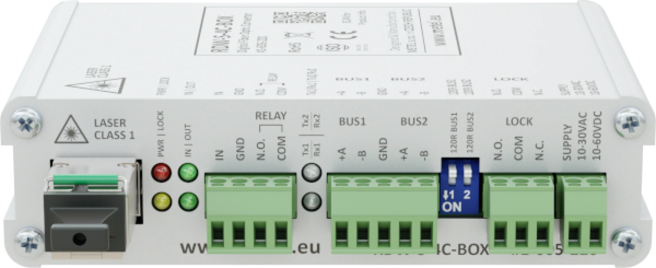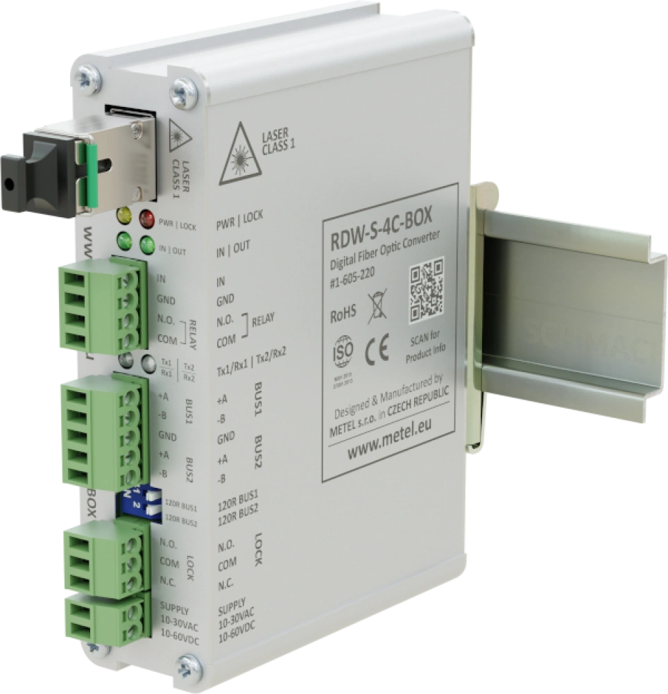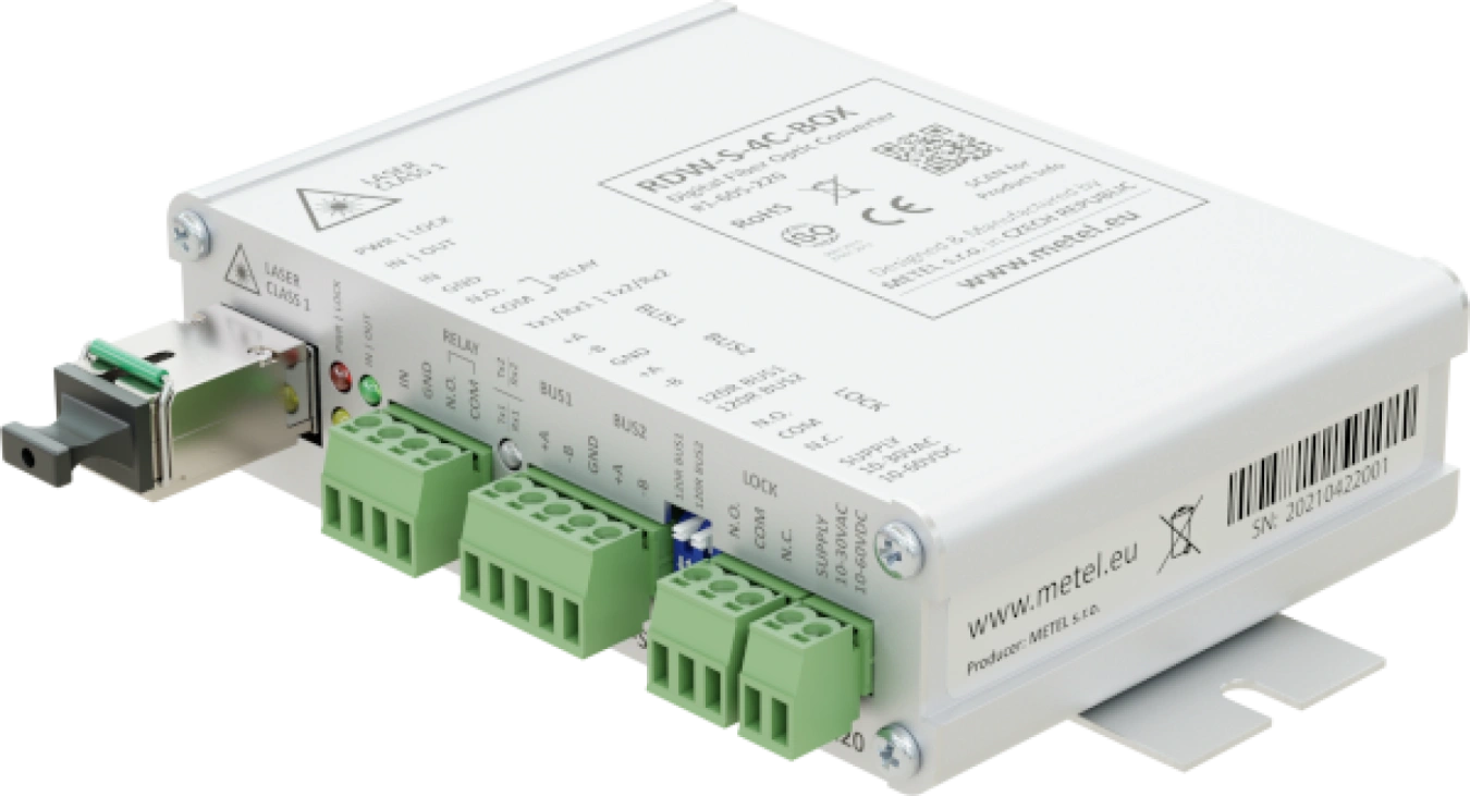 Przemysłowy transoptor cyfrowy - magistrala 2xRS485 lub 1xRS422, 1x styk dwukierunkowy i 1x przekaźnik LOCK do wykrywania przerwania światłowodu, awarii urządzenia przeciwnego i awarii zasilania.