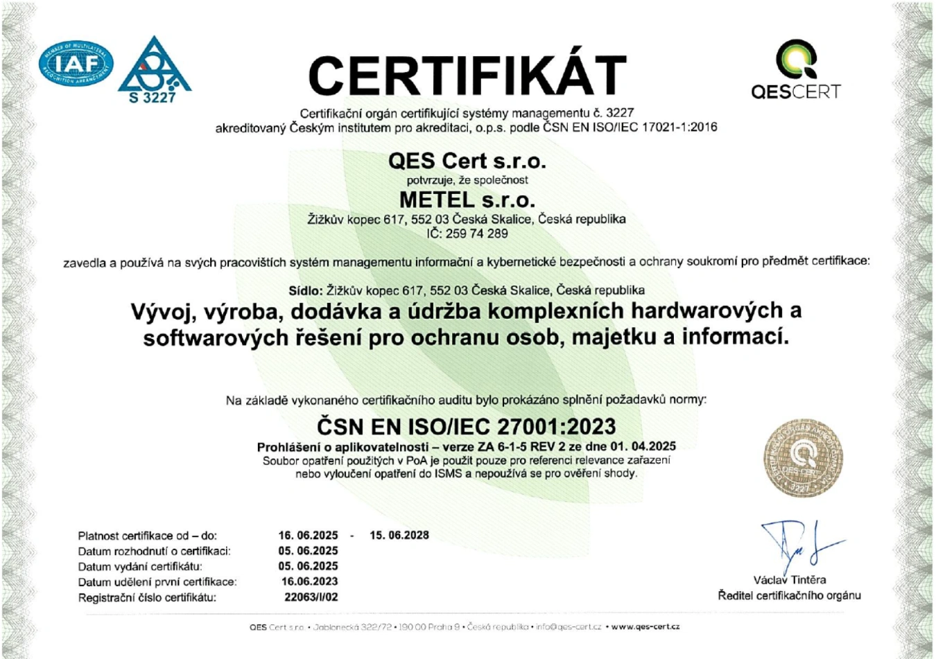 Bezpieczeństwo łańcucha dostaw: rozwój i produkcja są prowadzone wyłącznie w Republice Czeskiej. Kupujemy programowalne komponenty (mikroprocesory, pamięci) wyłącznie od producentów, których siedziby znajdują się w zaufanych krajach demokratycznych (UE, Japonia, USA, Kanada, Korea Południowa itp.). Minimalizuje to ryzyko związane z integralnością sprzętu.